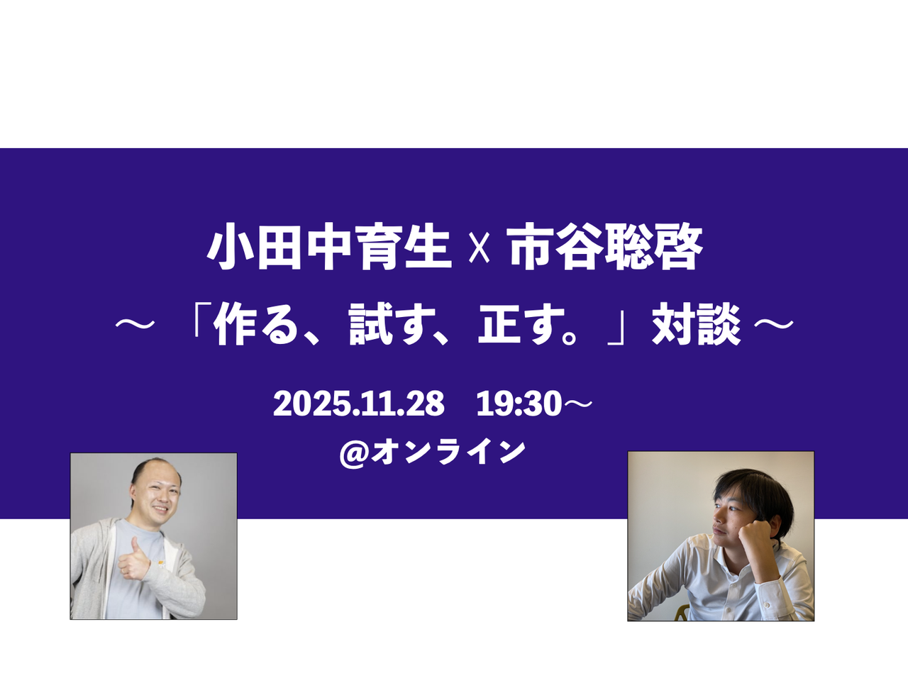 ## 小田中育生 ☓ 市谷聡啓 〜「作る、試す、正す。」対談〜 ### 私たちはいかにしてアジャイルを拡張するのか? 書籍「作る、試す、正す。 〜アジャイルなモノづくりのための全体戦略〜」について早々の感想をあげてくださった 小田中育生 さんをお招きして、この本についての対談を行います。 > > 本書がフォーカスするもうひとつの重要な概念が「とき」です。プロダクトをとりまく環境、そこにいる人たち、組織のあり方。いまこの瞬間の断面が永遠に続くわけではなく、ときの流れとともに変化していきます。仮説はアップデートしていく、またときの流れとともに立てていくものであるし、モノを作る人々は学び...