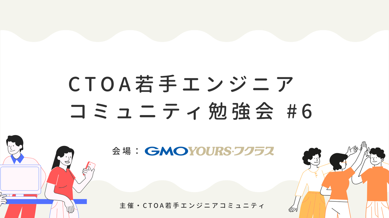 # 開催概要 若手エンジニア交流会 supported by 日本CTO協会の第6回目の開催です。 本交流会は、オフライン中心に同世代のエンジニア間で交流を深め、技術的な知見や挑戦について学びを共有することを目的としています。 * 日程: 2025/5/26 (月) 19:30-22:00(開場は19:00より) * 参加費: 無料 * 対象者: 学生インターンや新卒、エンジニア数年目など若手エンジニアの方々 本勉強会の様子を撮影し、SNSに投稿する可能性がございます。ご了承ください。 ## 会場 * 会場: GMO Yours・フクラス * 住所: 東京都...