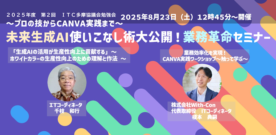2025年度 第2回 ITC多摩協議会勉強会「生成AI使いこなし術大公開!業務革命セミナー」~プロの技からCANVA実践まで~~未来を創る支援力 - ITCの力で切り拓け~業務の効... powered by Peatix : More than a ticket.