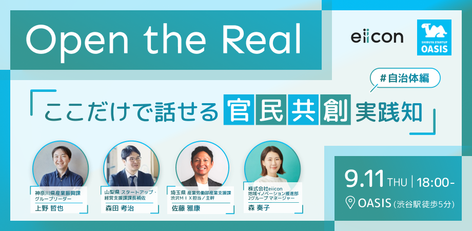 『Open the Real』の記念すべき第1回目は、スタートアップとの共創に取り組んでいる自治体職員をゲストとして招き、これまで数々のオープンイノベーション支援に従事してきたeiiconが、官民共創や公共調達の「リアル」を紐解きます。