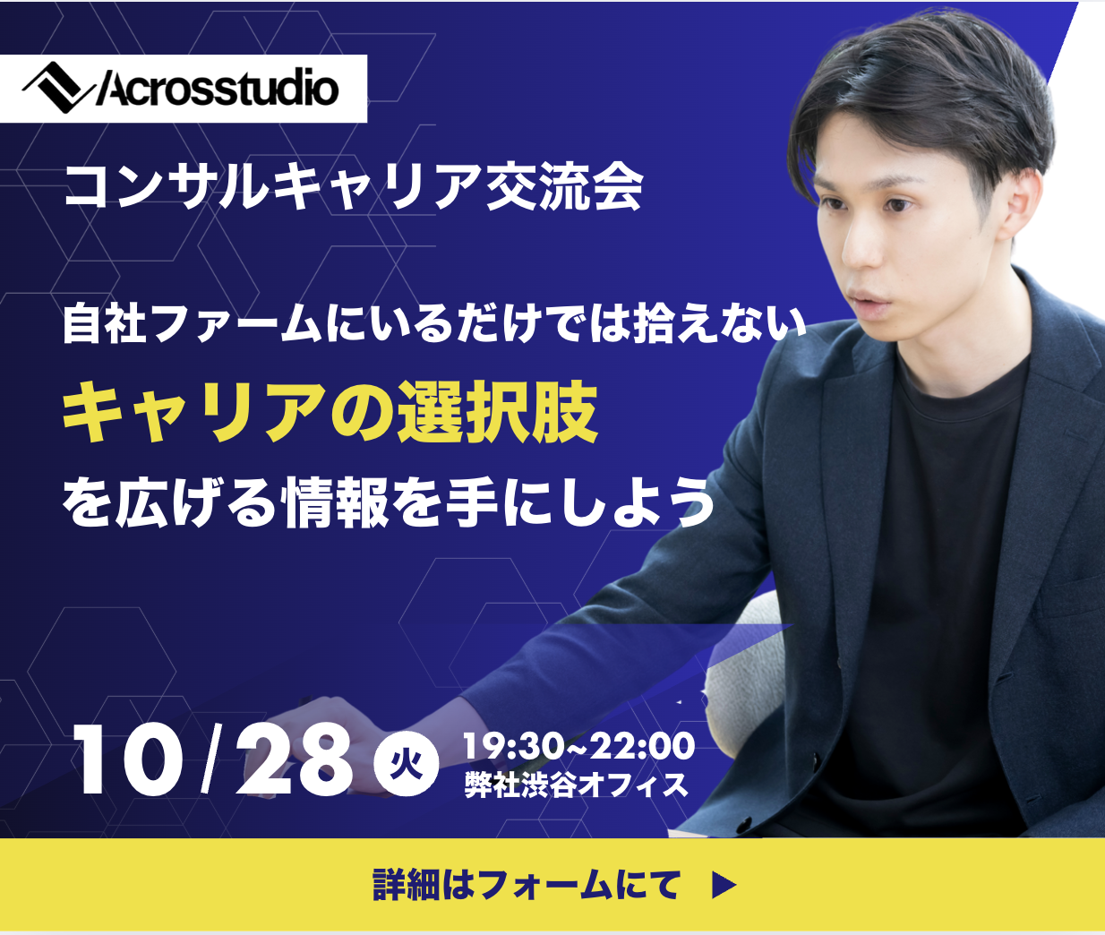 弊社では、コンサルタント向けに定期的に交流会【ConsultingStudio】を開催しております! 過去9回ほど開催しており、在籍してきた企業や各業界の現状や他の方の働き方など、ネットでは聞けない深くリアルなお話で毎回盛り上がっております!! ーコンサルキャリア交流会ー 自社ファームにいるだけでは拾えない、キャリアの選択肢を広げる情報交換イベント 概要: Big4・総合系・外資系ファーム出身のコンサルが集まり、キャリアのリアルを本音で語る交流会。 YouTubeチャンネル「コンサルの休日」運営会社として、大手ファームの最新動向から独立・起業・転職に至るまで、メディア では流せ...