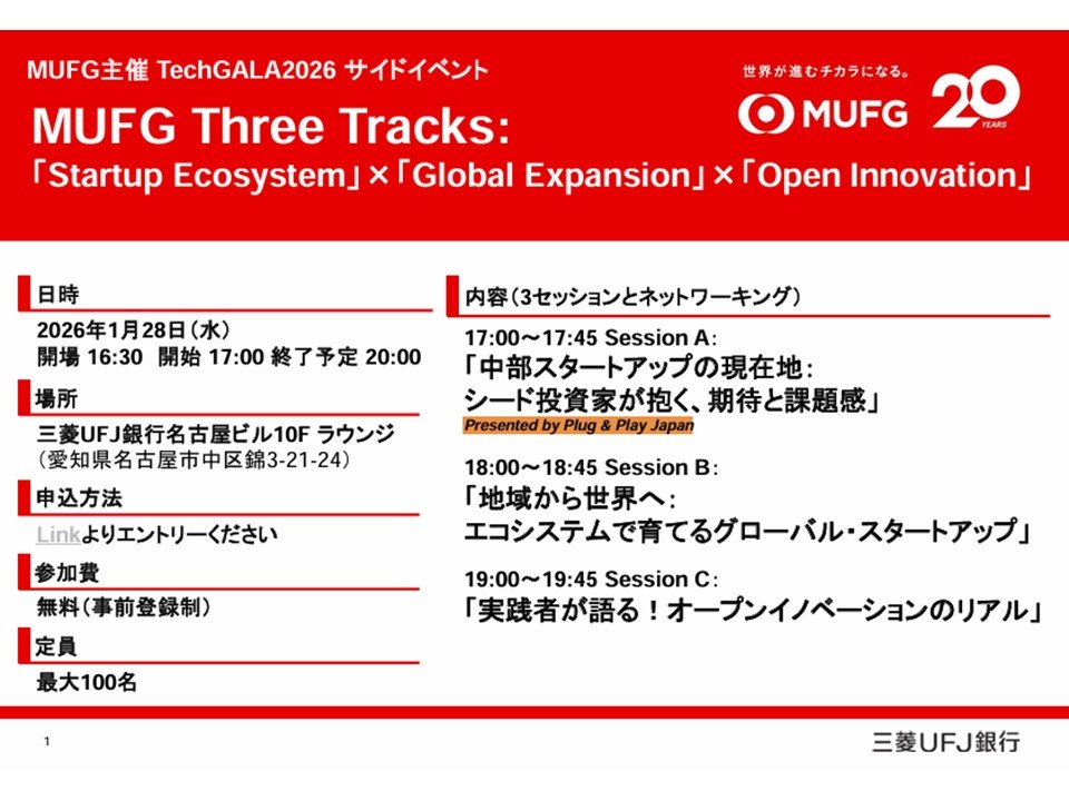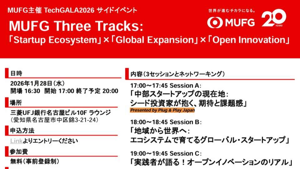 MUFG TechGALA初のサイドイベントとして、「Startup Ecosystem」×「Global Expansion」×「Open Innovation」をテーマに、豪華登壇者をお招きし、セッション主体のイベントを開催します。