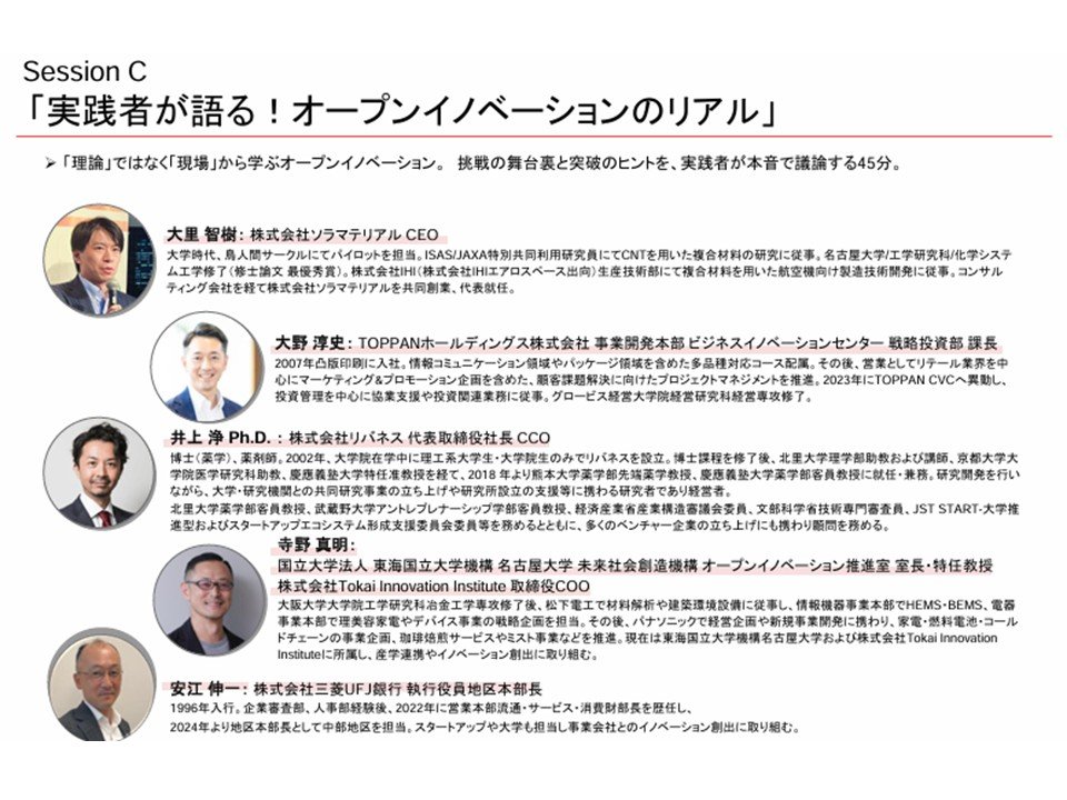 19:00~19:45 「実践者が語る!オープンイノベーションのリアル」登壇予定者:大里 智樹(株式会社ソラマテリアル CEO)、大野 淳史(TOPPANホールディングス株式会社 事業開発本部 ビジネスイノベーションセンター 戦略投資部 課長)、井上 浄Ph.D.(代表取締役社長 CCO)、寺野 真明(国立大学法人 東海国立大学機構 名古屋大学 未来社会創造機構 オープンイノベーション推進室 室長・特任教授、株式会社Tokai Innovation Institute 取締役COO)、安江 伸一(株式会社三菱UFJ銀行 執行役員地区本部長)