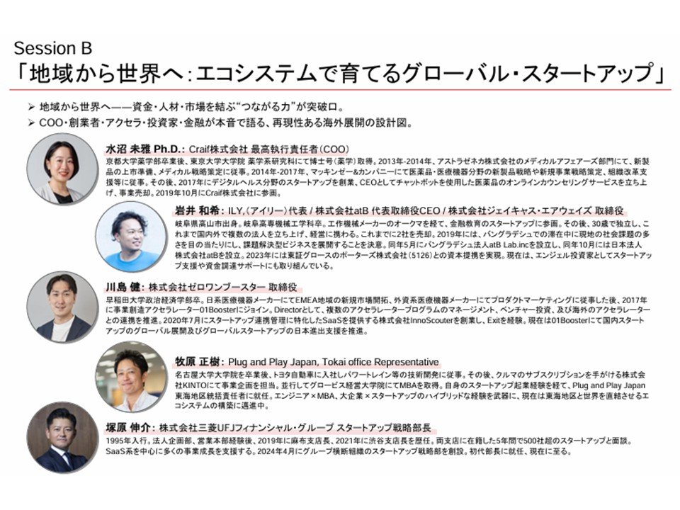 18:00~18:45 「地域から世界へ:エコシステムで育てるグローバル・スタートアップ」登壇予定者:水沼 未雅 Ph.D. (Craif株式会社 最高執行責任者(COO))、岩井 和希(ILY ,(アイリー)代表/株式会社atB 代表取締役CEO/株式会社ジェイキャス・エアウェイズ取締役)、川島 健(株式会社ゼロワンブースター 取締役)、牧原 正樹(Plug & Play Japan, Tokai office Representative)、塚原 伸介(株式会社三菱UFJフィナンシャル・グループ スタートアップ戦略部長)