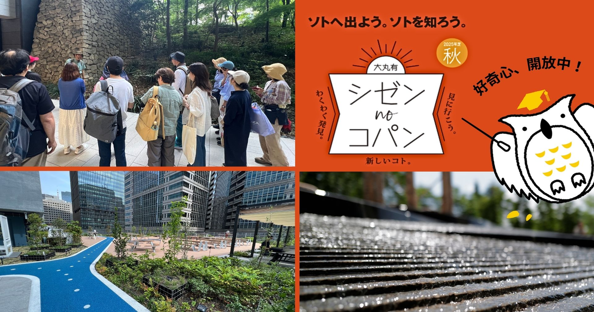 大丸有シゼンノコパン秋~「みる」から始まる新しい発見を~ビジネス街で自然を感じる!?「大丸有シゼンノコパン」は、大手町・丸の内・有楽町(大丸有)エリアで毎月開催される、まちの自然や緑に触れ、生きものとのつながりを感じながら、楽しくまちを散策するイベントです。私たちのまわりには、ふと見落としてしまいがちな自然の美しさや、四季の移ろいを感じられる場所がたくさんあります。このイベントでは、毎回その道のス