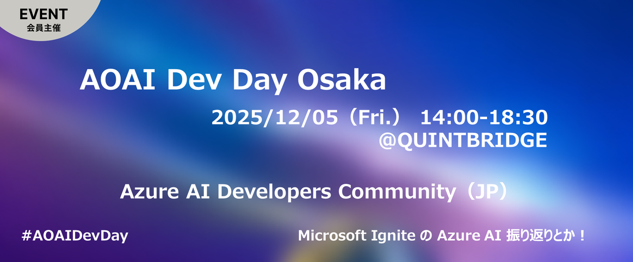 # イベント概要 Azure OpenAI Service を活用して本気でビジネスを変えたいすべてのビジネスマンやエンジニアのためのコミュニティの祭典「AOAI Dev Day Osaka」を開催します! 昨年大盛況だった東京でのイベントに続き、今年は大阪での開催が決定しました。 ## こんな方におすすめ * Azure OpenAI Service の最新情報をキャッチアップしたい * AI エージェント開発に興味がある * AI 駆動開発の最先端を学びたい * 同じ関心を持つエンジニア・ビジネスマンとネットワーキングしたい * 責任あるAI、データ利活用...