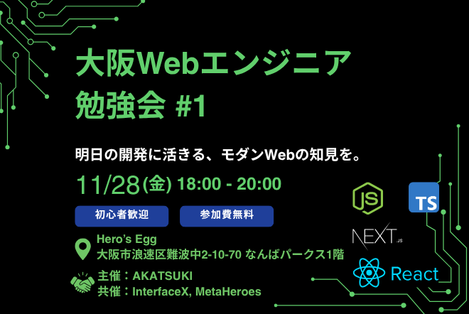 # 大阪Webエンジニア勉強会 #1 #### 明日の開発に活きる、モダンWebの知見を。 ■過去こんなことやってました \- フルスタックTypeScriptを支える技術 \- Node.js+Express+Socket.ioで QRコードリーダーサーバー をつくるよ! * * * ## 🧠 勉強会概要 「大阪Webエンジニア勉強会」は、モダンWeb開発の実務知見を共有するコミュニティイベントです。 React / Next.js / Node.js / TypeScript / Docker などをテーマに、 現場で活かせる知識や実装ノウハウを中心に、登壇...