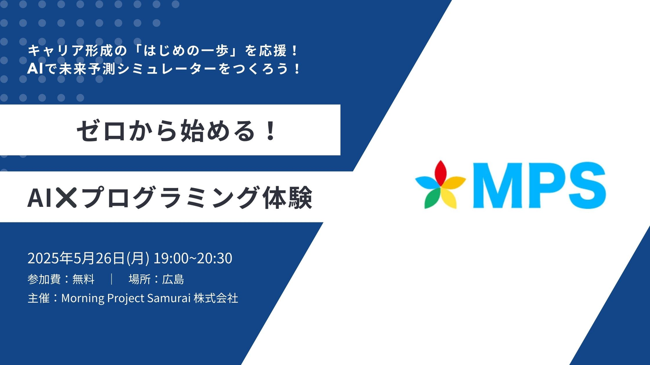 ## 🖥️ゼロから始める!AI✖️プログラミング体験 AIって何?プログラミングの仕事に興味あるけど、何から始めればいいの? そんな「はじめの一歩」を応援する体験イベントです。 AIを使って、自分の「3年後の未来」を予測するWebアプリを一緒に作ってみませんか? ふらっと遊びにくるような気持ちでどうぞ(^^) 「なんとなく面白そう」「仕事に役立つスキルを気軽に体験したい」「転職やキャリアの選択肢を考え始めたい」 ひとつでも当てはまったら、ぜひ気軽に参加してみてください! ## 🎉こんなことが体験できます! ・ コードは書かなくてもAIが代わりにアプリを作ってくれる...