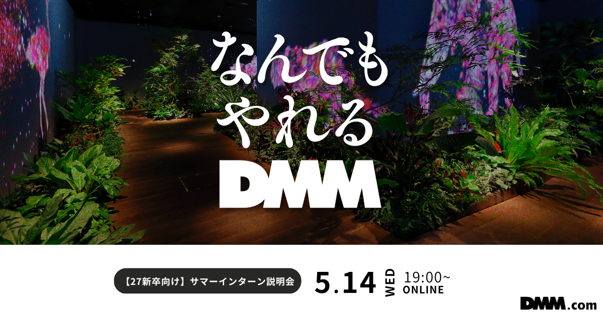 # 27新卒 サマーインターン説明会 27新卒として就活中の学生エンジニアを対象に、DMMのサマーインターンの説明会を実施いたします! DMMではGUILD・Core・Sprintの3種類のインターンを展開しており、経験できることや関わる部署・技術領域も様々。 会社説明やインターン紹介はもちろん、実際にインターンに参加したエンジニアからエピソードトークも聞けちゃいます! また、登壇予定のエンジニアは今年4月に入社したばかりの25新卒たち! そんなフレッシャーズたちから、DMMのインターンを経て入社を決めた理由、どんな学びや成長があったかなどのお話も交えながらお届けします! ...
