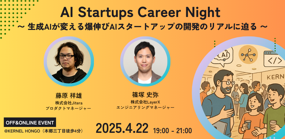 AI Startups Career Nightは、各毎回専門家や起業家に登壇いただき、キャリアに役立つ最先端のトピックを深掘りするシリーズ企画です。第11回は、生成AI時代のプロダクト開発を牽引する急成長AIスタートアップで活躍する2名を迎え、現場のリアルな声を深掘りします。