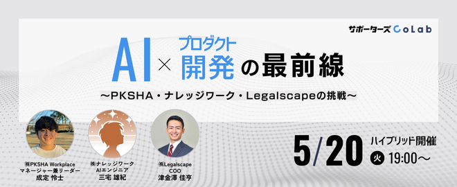 ## 📍 イベント概要 「AI×プロダクト開発の最前線」をテーマに、3社によるLT勉強会を実施します。 PKSHA、ナレッジワーク、LegalscapeとAI領域で業界を牽引する3社からキーマンが登壇。 ハイブリッド開催となり、現地参加の方は登壇者との交流、質問機会もご用意しております。 ## 📕 勉強会テーマ 「AI×プロダクト開発」をテーマに、3社が生成AIはじめとしたAIをどのようにプロダクトに活用し、 どんな新しい技術、事例、課題、成果が生まれているかを実例を元に共有いただきます。 生成AIをはじめとしたAIの進化により、プロダクト開発の手法やサービス運用が大きく変...