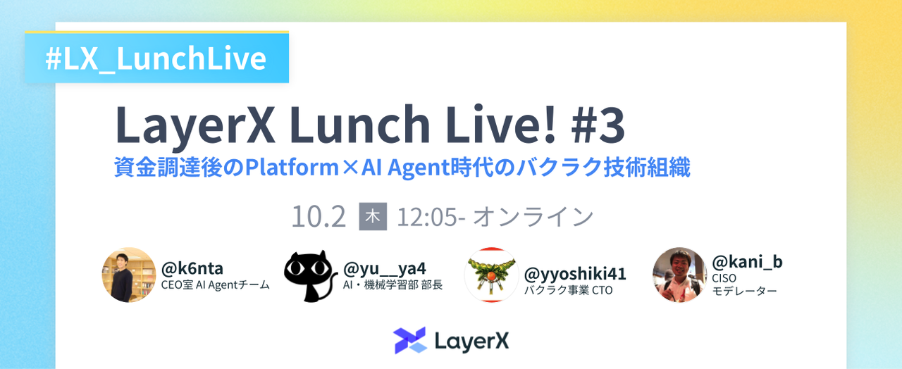 # 本イベントについて 今月、株式会社LayerXはシリーズBで150億円の資金調達を実施したことを発表しました。 LayerX、シリーズBで150億円を調達。エンジニアの採用を強化し、AIエージェント事業をさらに加速 https://prtimes.jp/main/html/rd/p/000000518.000036528.html この度の資金調達の発表を受け、LayerXの事業と組織の未来についてより深く知っていただく機会として、オンライン配信「LayerX Lunch Live!」を開催します。 今回は、資金調達を経てバクラク事業部のPlatform組織の未来...