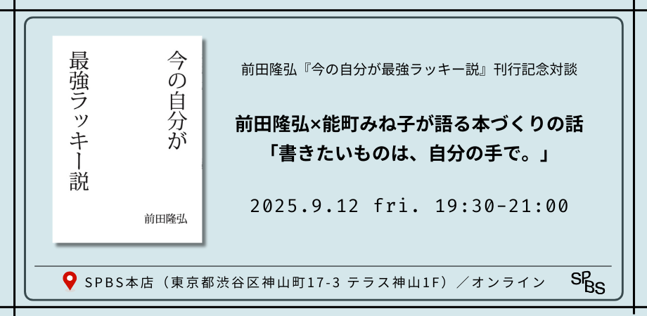 編集者・前田隆弘さんが、エッセイ集『死なれちゃったあとで』に続き、最新刊『今の自分が最強ラッキー説』を2025年5月に刊行されました。 SPBS本店では、本書の刊行を... powered by Peatix : More than a ticket.