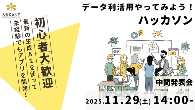 # 【ご案内】会場はQUINTBRIDGE 2階のキッチン前です(1階ではありません) # 概要 このイベントは、大阪公立大学が主催するハッカソンイベントです。 この日は中間発表会を行います。 ## 開催日時 2025年11月29日(土)14:00〜17:00 ## 会場 QUINTBRIDGE 2階 キッチン前 (大阪市都島区東野田町4丁目15番82号) アクセスマップ ※オンライン会場の設定はありません。 ## 持ち物(必須) ・ノートパソコン(WindowsまたはMac) ・飲み物(会場内に自販機はありません&土曜日のためカフェは営業していま...