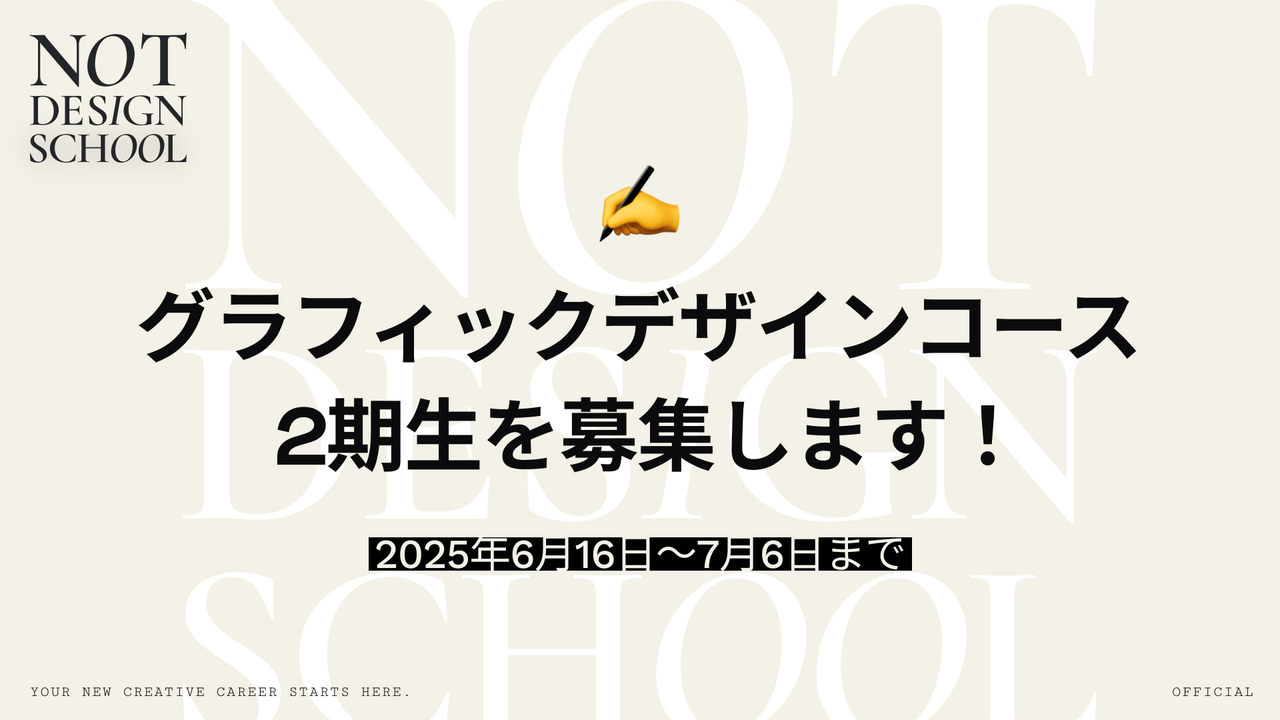 # 概要 半年ぶりに、グラフィックデザインコースの新規生徒を募集します! 「ちゃんと学びたい」に応える、デザインの学び場へ。 本気でグラフィックデザインを学びたい。 でも、独学では限界がある。 センスに頼らず、プロとして通用する「伝える力」を身につけたい。 そんなあなたのための【NOT DESIGN SCHOOL グラフィックデザインコース】の説明会を開催します! この機会をお見逃しなく! ## ✔️ この説明会でわかること * コースのカリキュラムや学習の進め方 * 他スクールとの違い * 1期生の成長例や卒業後の進路 * どんな人が...