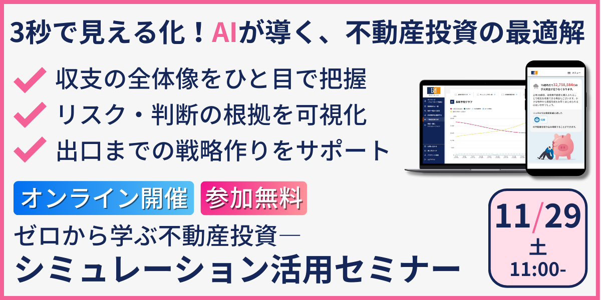## ▼セミナー概要 弊社の収益物件シミュレーションサービス『リッチAI』は、2025年5月に会員登録者が2,500名を突破いたしました。 今回のセミナーでは、リッチAIの開発に携わってきた担当が、不動産投資で欠かせない投資指標や一棟投資の相場空室率・賃料下落率について解説いたします。 また、AI査定機能を搭載しているリッチAI。 「実際の精度は?」など、皆さまの素朴な質問にもお答えさせていただきます。 ## セミナー内容 ### ■不動産投資の目的 ### ■シミュレーションで投資の不確実性を抑える ### ■不動産投資の利益とは ### ■不動産投資シミュレーション ...