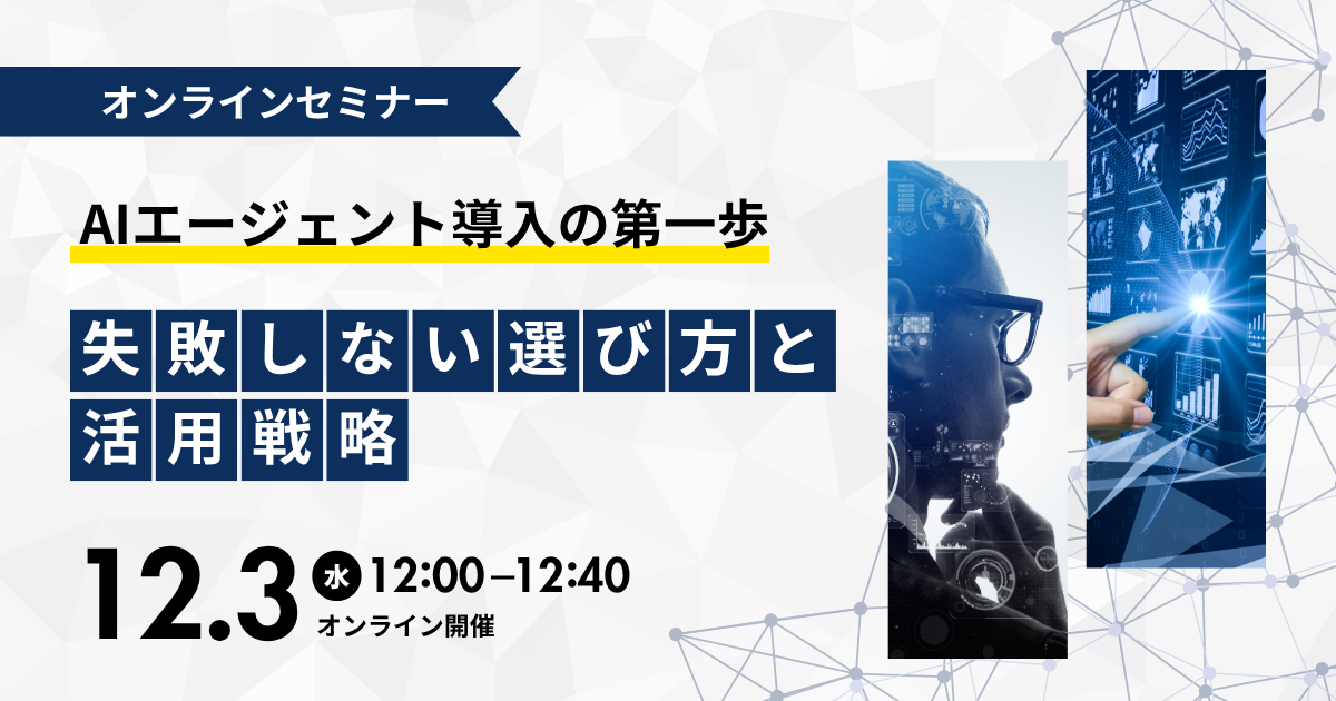 ### 概要 生成AIの進化に伴い、業務や顧客対応を支える「AIエージェント」への関心が高まっています。一方で、種類や組み合わせ、着手すべき業務の選び方に迷う企業も少なくありません。 本ウェビナーでは、代表的なエージェントの類型と特徴を整理し、導入判断に効く選定基準を事例とともに解説します。さらに、非エンジニアでも多数のエージェントを使いこなすコツや、弊社のエージェント作成サービスで置き換え可能な業務を、明日から試せる具体度でご紹介いたします。 開催日:12月3日(水)12:00-12:40 ※募集締め切り 12月3日12:00 開催形式:オンライン(Teamsウェビナー...