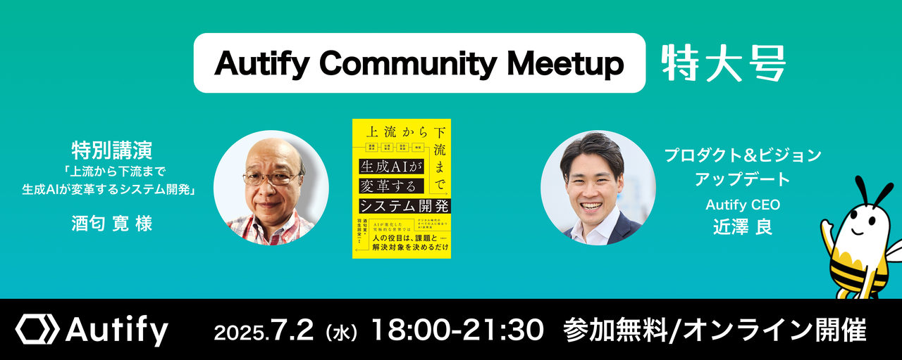 # 申し込み多数につき増枠しました! # Autify Community Meetup 2025 特大号 Autifyユーザーの皆様や、Autifyを応援してくださっている皆様への日頃の感謝の気持ちを込めて、Community Meetup特大号をやります! 通常はユーザーの皆様のみ、かつ東京でのオフライン開催のみですが、今回はなんとオンライン・オフラインハイブリッドで、どなたでもご参加可能です! (オフライン参加は現在Autifyをご利用中の皆様に限らせて頂きます、詳細はコミュニティSlackをご確認下さい) 当日はいくつかの新製品発表を予定しています(まだ内緒)。AI時代にも...