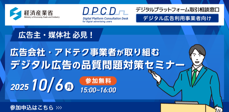 広告会社・アドテク事業者が取り組むデジタル広告の品質問題対策セミナー ~デジタル広告取引の透明性向上に向けて~ ◆セミナー概要 デジタル広告市場は、広告枠の売買がリ... powered by Peatix : More than a ticket.