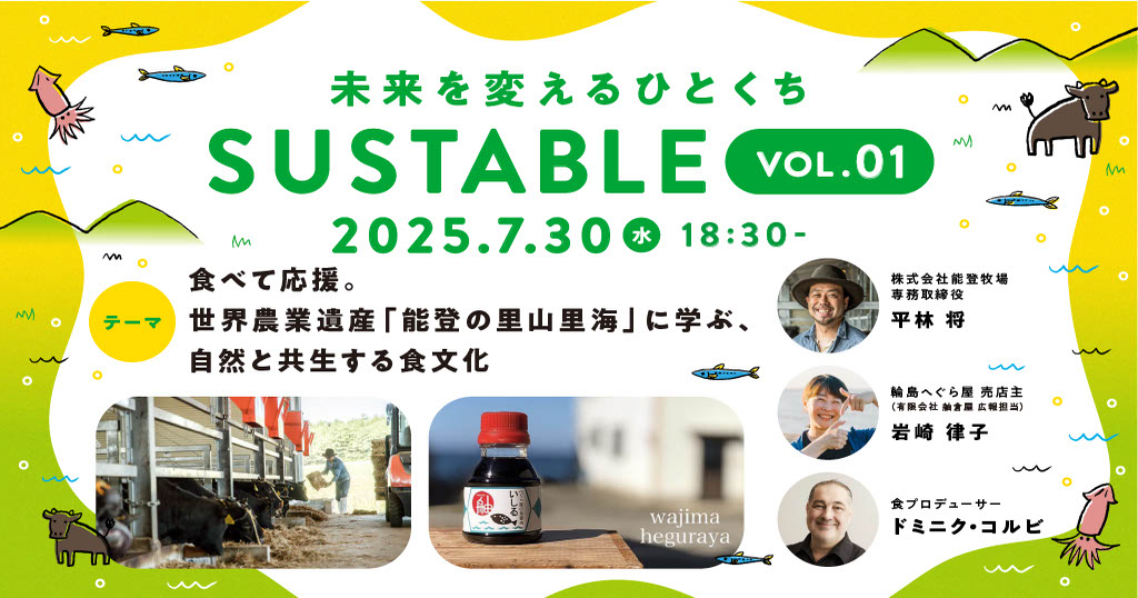 サステナブルフードについて“おいしく・楽しく”学べる『SUSTABLE2025VOL.1』開催のお知らせSUSTABLE(サステーブル)とは、食の「作り手」である生産者、「使い手」であるシェフ、そして「食べ手」である消費者(=聴講者)が集い、毎回、ある「サステナブルフード」をテーマにして、背景にある社会課題を学びながら、実際にサステナブルフード食べて、五感で食の未来を考えるセミナーです。日々の食卓