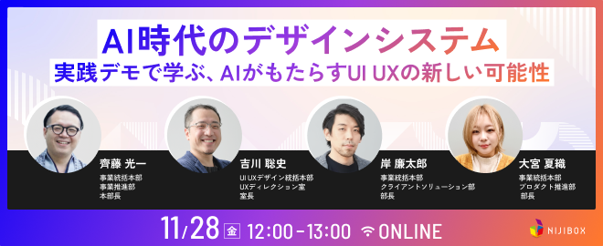 ## 本イベントはオンラインで行います ・配信はYouTube Liveで行います。当日の視聴URLはお申し込みいただいた方へ当日にお知らせいたします。 ・本イベントは、事前に録画した映像を配信いたします。 ## 今回のテーマは『AI時代のデザインシステム〜実践デモで学ぶ、AIがもたらすUI UXの新しい可能性〜』 「デザインシステムは必要だと思うが、費用対効果を説明しきれず、導入まで踏み切れない」 そんなお悩みはありませんか? AI時代の今、デザインシステムの重要度はより高まってきていると考えられます。活用することで、生産性やブランド力の大きな向上が期待でき...