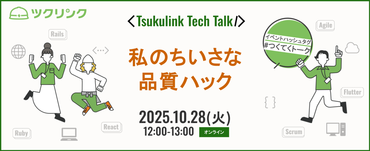 # イベント概要 ## つくてくトーク 〜私のちいさな品質ハック〜 [イベント開催日:2025年10月28日 (火)] [開催時間:12:00 〜 13:00 (JST)] [開催形式:オンライン(meet)] 日々の「ちいさな工夫」が、未来の「大きな品質」につながる。 今回の「つくてくトーク」は、『私のちいさな品質ハック』がテーマです。 開発の生産性と品質担保を両立させるための、日々のちょっとした工夫やTIPSを共有し合う、エンジニアとQAのためのオンライン勉強会です。 例えば、こんなことを考えたことはありませんか? * 「テストコード、もっと楽に書けな...