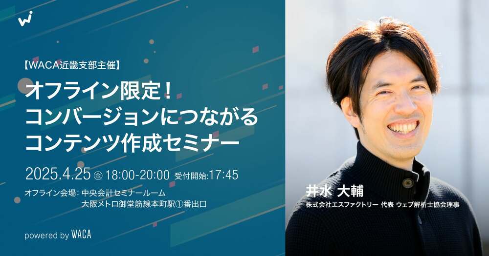 2025-04-25(金)18:00 - 20:00 セミナー概要 【2025年度第1回セミナー開催!】 「コンバージョンにつながるコンテンツ制作の極意」 2025年最初のセミナーは、大阪出身で現在WACA理事を兼任する井水大輔氏をお迎えし、「コンバージョンにつながるコンテンツ制作の極意」を学びます。 ウェブ解析は、事業の成長を促進するための体系的な知識ですが、皆さんは日々の業務でどれほど活かせていますか? 本セミナーでは、数多くの企業を成長に導いてきた井水氏のワークを交えながら、実践的なノウハウを学ぶことができます。業務に役立つヒントが満載の内容なので、確実にスキルアップにつな...