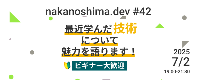 # 開催日時 2025/07/02(水) 18:50 受付 19:10 開始 21:15 終了 # 場所 大阪 グランフロントでの現地開催です。 また、オンラインでの配信は行いません。 来場された際、会場エントランスでのアルコール消毒のご協力をお願いします。 # イベントについて 「nakanoshima.dev」とは、クラウド技術や様々なテクノロジーに触れていただき、関西圏のエンジニアにとっての学びの場として開催している勉強会です。 セミナー、ハンズオン形式を交えてさまざまなイベントを定期的に開催を予定しています。 IT企業で働く社会人から興味...