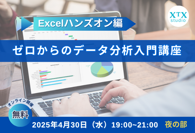 ## 「週末は忙しい…」「仕事帰りにスキルアップしたい…」そんな皆様のリクエストにお応えして水曜日19:00~開催!! \ハンズオンで学びたい!/ 実際に手を動かしてデータ分析を学びたい!というお声から生まれたこの講座。 ぜひ一度、一緒に入り口から学んでみませんか! ## こんなお悩みありませんか? ・データの扱い方がわからない ・Excelは使えるけど分析は苦手 ・業務にデータをどう活かすかわからない ・売上や結果をデータで見える化したい ・統計やAIの専門用語が難しい ・分析結果をどう判断すればいいか悩む ・DXに興味があるが、どこから始めるべきか迷っている #...