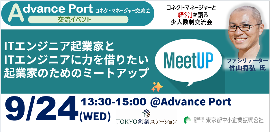 「このアイデアがあれば、世の中はもっと良くなるはず」 胸に秘めた熱い想いと、緻密に練り上げた事業計画。しかし、それを形にするための「技術」という壁が、 あなたの前に立ちはだかっていませんか? 「自分の技術力や経験を、もっとダイレクトに社会へ貢献できる、エキサイティングな挑戦に使いたい」 スキルを磨きながらも、心のどこかでそんな衝動を感じているITエンジニア起業家の方はいませんか? 創業初期のスタートアップにとって、テクノロジーは事業の成否を分ける生命線です。 そしてその核心を担うエンジニアは、単なる「開発者」ではなく、共に未来を創る「共同創業者」であり「パートナー」です。 しかし、多くの起業家が、この最も重要なパートナーとの出会いに苦労しているのが現実です。 一方で、多くの優れたITエンジニア起業家も、自らの能力を解き放つにふさわしい「ビジョン」や「アイデア」との 出会いを求めています。 もし、この両者が、互いの情熱と才能を掛け合わせることができたなら。 そこに生まれるのは、単なるプロダクトではありません。大きなうねりを起こす「事業」そのものです。 TOKYO創業ステーションAdvance Portは、そんな出会いを創り出すための場として、ミートアップイベントを開催します。 このイベントは、単なる名刺交換会ではありません。 一人ひとりが持つビジョンや課題、そして技術力を深く共有できる対話の場です。 ITエンジニアの力を借りたい起業家のあなたへ ここでは、あなたのビジョンに共感し、事業の成長にコミットしてくれる、未来のCTOや技術パートナーが 見つかるかもしれません。 あなたのアイデアが、確かな技術という翼を得て、大きく羽ばたくための第一歩がここにあります。 自身の技術力や経験を、「新たな事業」にしたいITエンジニア起業家のあなたへ ここでは、あなたの技術力を心から必要とし、リスペクトしてくれる起業家が待っています。 0→1のフェーズにジョインする興奮と、自らのコードで事業をドライブさせる、かけがえのない経験があなたを待っています。 あなたのアイデアと、誰かの技術が交差する日。 未来を実装する、運命のパートナーシップが、ここから始まります。 熱意あるあなたのご参加を、心よりお待ちしております。