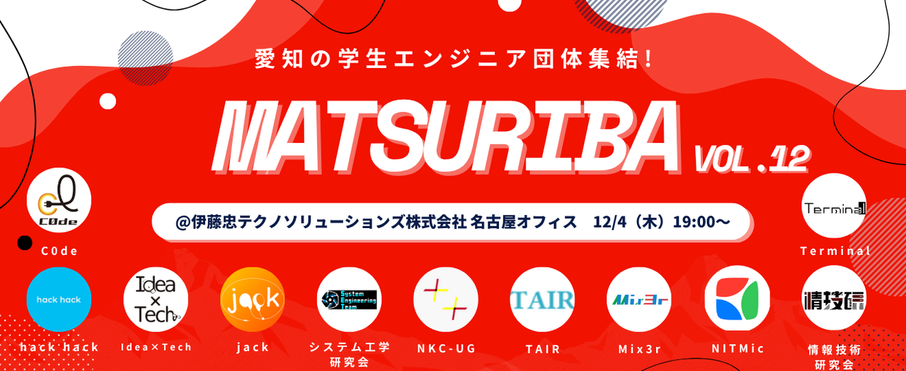 # 🏮 About Matsuriba MatsuribaTech は東海地方の学生の出会いを生み出すための、東海地方最大の学生エンジニアコミュニティです。 現在 Idea×Tech・hackhack・NKC- UG・システム工学研究会・jack・C0de・TAIR・Mix3r・NITMic・情報技術研究会・Terminal の11つの加盟団体+東海のエンジニア学生でイベントを展開🔥 # 💡 イベント概要 東海の学生エンジニア同士の出会いを生み出す場として Matsuriba(祭り場)を定期的に開催 懇親会・賑やかしLTを通して学生同士・学生団体同士の交流をしましょう! ###...