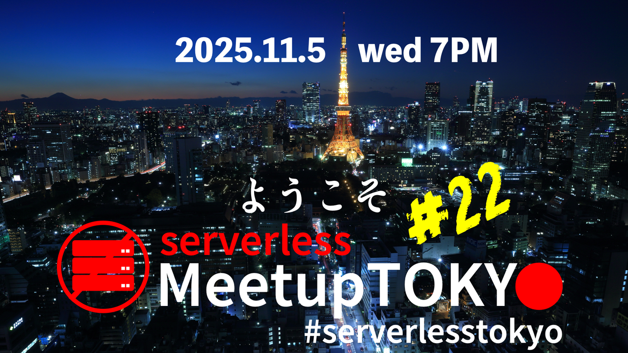 最新情報は、下記より発信いたします。ご確認の程よろしくおねがいいたします。 * connpassのイベントページ、およびconnpass経由のメール * Twitterアカウント @serverlessjp およびハッシュタグ #serverlessjp * * * # はじめに (重要事項) * ハッシュタグ #serverlesstokyo ### Meetupイベントのスピーカーを公募しています Serverless Community(JP)では以下のようなセッションを話してもらえる人を通年で募集しています。 ## ▼主なテーマ 1. サーバーレス...