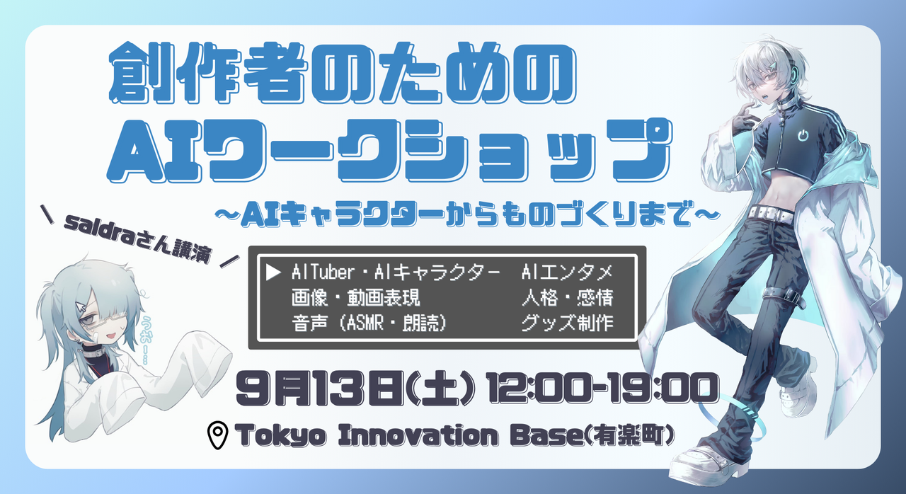 # 創作者のためのAIワークショップ ### \生成AI・AI創作・キャラクター制作に興味がある皆さん大歓迎/ AI初心者歓迎!何かつくってみたいものがある創作者のためのワークショップです。 AIをどのように活用することで、自身の創作や表現に活かせるのか知りたい人にとって 今後の創作の発展のきっかけや相談者を作れるようになることを目指します。 ## 今回のワークショップで作るもの saldraさんによるLLMを用いたキャラクターの制作手法および、キャラクター運用のグッズ制作についての考慮点に関する講座を行った後、 参加者の興味範囲に合わせてグループに分かれ、それぞれの創作のための...