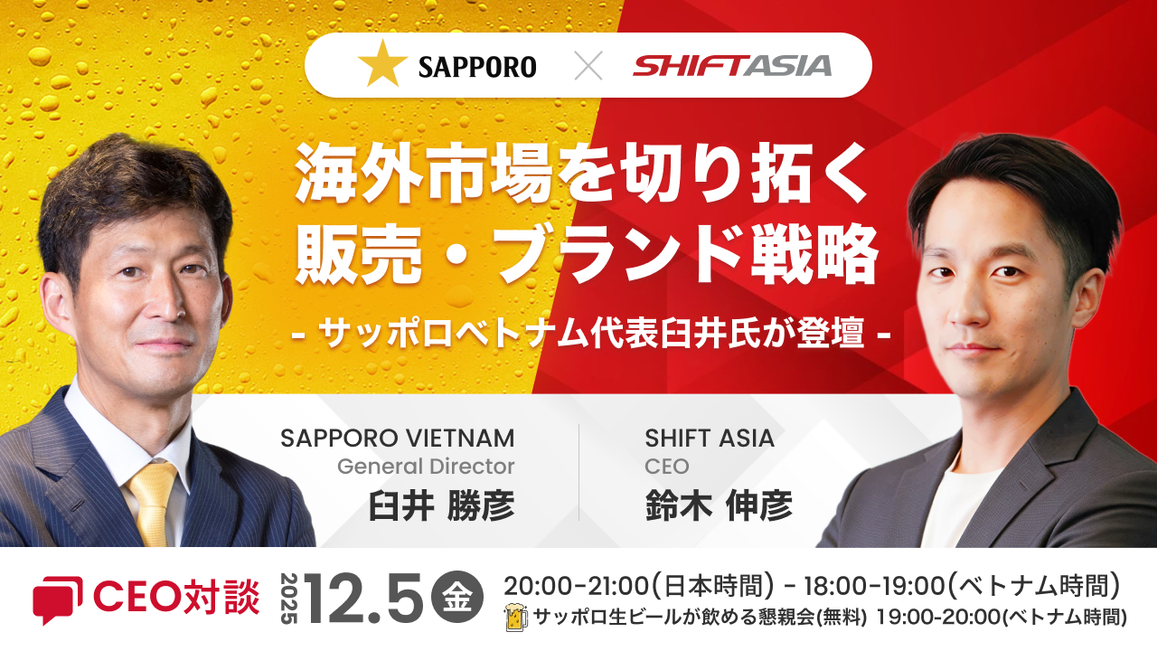 ## イベント概要 「CEO対談」は、ベトナムでご活躍中の経営者をゲストに迎え、弊社SHIFT ASIAのCEO鈴木との対談を通じて多様なテーマについて深掘りするイベントです。今回で第6回を迎え、最近では毎回100名を超える参加者の方々からご好評をいただいております。 本イベントでは、サッポロビールのベトナム拠点として、海外市場の開拓とブランド構築への挑戦を続けるサッポロベトナム代表の臼井勝彦氏をお招きし、同じくベトナムでソフトウェアの開発・テスト事業を展開するSHIFT ASIA代表の鈴木との対談をお届けします。 多くの強力な競合がひしめくベトナム市場に後発で参入...