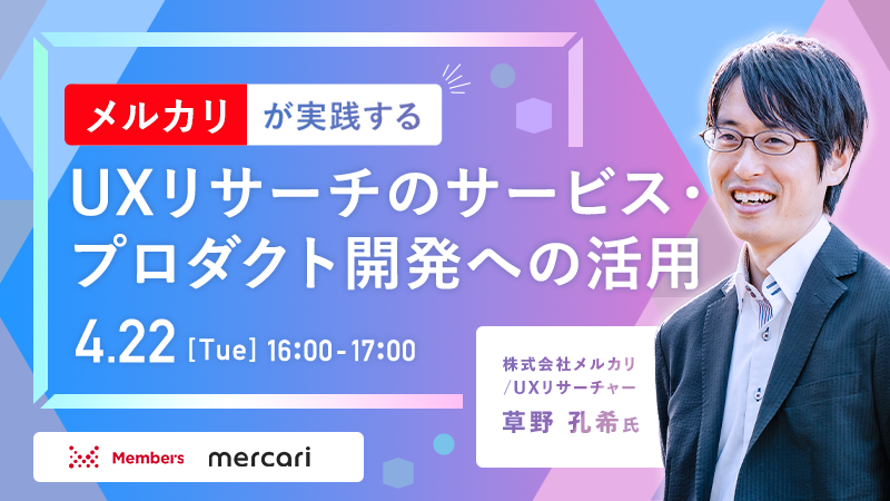## 開催日時:2025年4月22日(火) 16:00〜17:00 新しいサービスやプロダクトを生み出すためのヒントがここに UXリサーチをどのように活かせば、より良いサービスやプロダクトにつながるのか? 多くの企業がリサーチの重要性を認識しながらも、具体的な方法や活かし方に悩んでいます。 そのような中、メルカリでは数々のリサーチをサービスやプロダクトの開発に活かしています。そこで本セミナーでは、株式会社メルカリのUXリサーチャーである草野孔希氏をお招きし、具体的な実践事例を通じてお話いただきます。 セミナーで得られること ・メルカリにおけるサービスやプロダクト開...