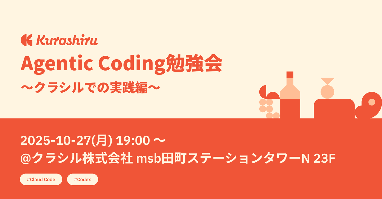## ご参加される方へ 19時に開始しておりますが、遅れる方は23Fに直接来ていただくか、X(@Kurashiru_dev)までDMいただければご案内します! ## 📝開催概要 クラシルでAIコーディングに関する勉強会を開催します! クラシルでは月10万円までのAIエージェント利用補助制度「AI First制度」を導入しています。 今回はそれらのツールを使った業務での活用事例やそれ以外の使い道など、クラシルのエンジニアならではの知見やリアルを共有します。 発表後は懇親会でご飯を食べながらクラシルの開発メンバーやその他メンバーとのネットワーキングも予定していますので、お気軽...