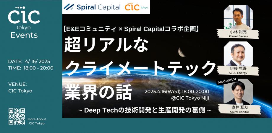 E&EコミュニティとSpiral Capitalがタッグを組み、クライメートテックスタートアップで活躍するゲストをお招きし、"超リアルな話"を複数回に渡ってテーマごとに深堀... powered by Peatix : More than a ticket.