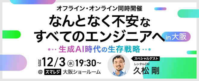 ## 🎉イベント概要 「このままでいいのかな」——そんな漠然とした不安を抱えたことはありませんか? 生成AIの進化で、技術も働き方も急速に変化する今。私たちエンジニアは、これからどう生きていけばいいのか。 本イベントでは、ゲストの久松さんをお迎えし、エンジニアが抱える “なんとなく不安” に真正面から向き合います。 大阪本社のオフライン開催に加え、オンラインも同時開催! 堅苦しいセミナーではなく、ざっくばらんに語り合い、未来へのヒントを一緒に見つける カジュアルMeetup です。 ### 📝オフライン限定!職務経歴書の添削、個別キャリア相談も! 大阪本...