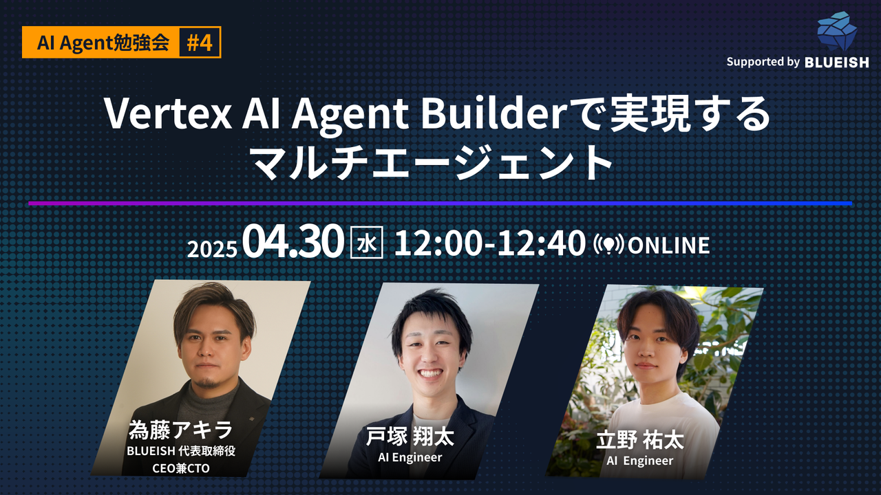 # ✍️ 概要 BLUEISHでは、「すべての業務プロセスをAI化する」というビジョンのもと、業務プロセスを最適化するAIソリューションを提供しています。 本イベントは、Google Cloudが提供するプラットフォーム「Vertex AI Agent Builder」がテーマになります。 Agent2Agentプロトコル(A2A)やAgent Development Kit(ADK)を含めてご紹介します。 また、Vertex AI Agent Builderとは何か、1から詳しく学んでいくことができます。 これからキャッチアップする方や、興味がある方におすすめです。ぜひ、皆...