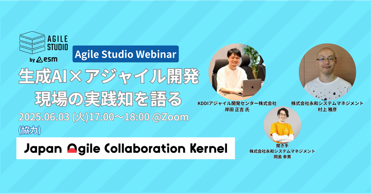 # 概要 生成AIが開発の現場に浸透しつつある中で、アジャイルを実践する開発チームはどのように向き合い、取り入れていけばよいのでしょうか? 今回のウェビナーでは、AIツールの導入に挑戦しているKDDIアジャイル開発センター(KAG)の岸田さんをお招きし、弊社エンジニアの村上と、それぞれの現場での取り組みや気づきを対談形式で紹介します。 技術的な工夫や導入にまつわる悩み、チームとの向き合い方など、試行錯誤の過程を共有しながら、これからの開発のヒントを探っていきます。 本ウェビナーは、Agile Studio が主催し、Japan Agile Collaboration Kern...