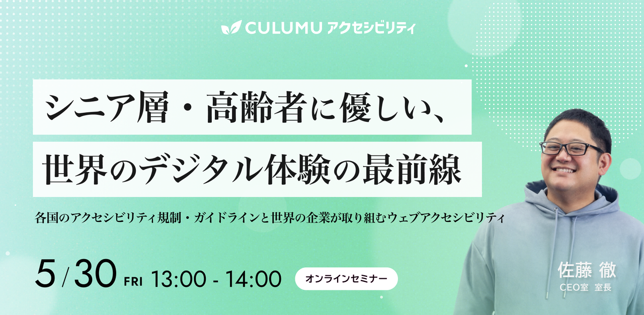 高齢化が進む中、ウェブやアプリの「使いやすさ」は企業の信頼を左右する重要な指標になりつつあります。 本セミナーでは、シニア層のデジタル行動の変化や世界のアクセシビリティ規制に触れながら、視認性や操作性を高めるための具体的な改善アプローチを紹介。グローバル企業の先進事例をもとに、なぜ今アクセシビリティ強化が必要なのか、そして取り組みがブランド価値や顧客ロイヤルティ向上にどうつながるのかを整理します。今後の対応に悩むご担当者に向けて、実践的なヒントが得られる内容です。 ## 【こんな方におすすめ】 * ウェブサイトやアプリの開発・運用を担当している方 * アクセシビ...