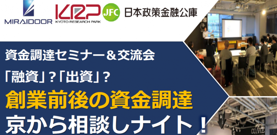 京都リサーチパーク株式会社、株式会社日本政策金融公庫、ミライドア株式会社の共催で、起業を目指していて、資金調達に関心がある方に必見のイベントを開催します! ・京都府内に拠点を持つ、... powered by Peatix : More than a ticket.