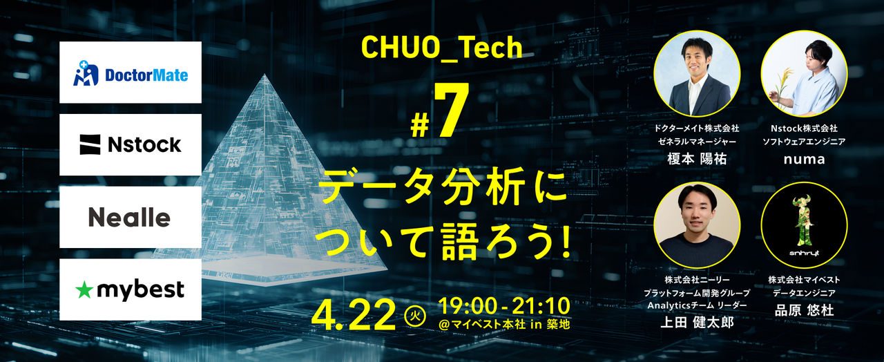 ## 概要 CHUO Techは、中央区に会社のある企業が集まって立ち上げた勉強会です。第7回となる今回は、「データ分析」をテーマにワイワイします! 参加対象は、中央区を問わず全エリアです!中央区に勤務・お住まいでなくとも、登壇する企業に興味がある方、テーマに興味がある方はどなたでも遊びにきてください! 今回は4社による共同主催です👏 * 株式会社マイベスト * 株式会社ニーリー * Nstock株式会社 * ドクターメイト株式会社 ## こういう人におすすめ! * データ分析・活用についての取り組みを聞きたい!語りたい!な方 * 中央区のTech企業...