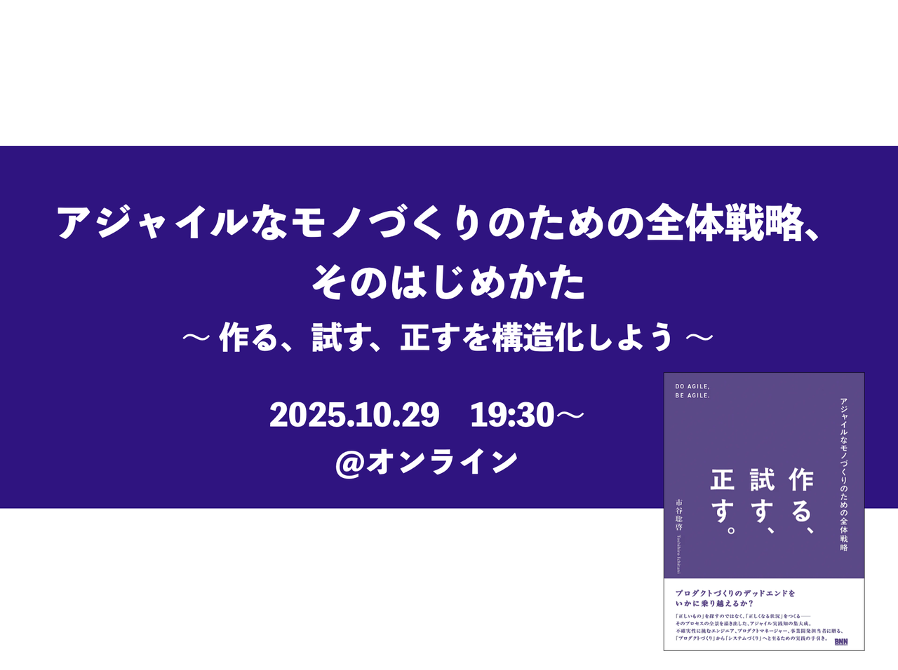 ## アジャイルなモノづくりのための全体戦略、そのはじめかた ### 〜作る、試す、正すを構造化しよう〜 10月29日に書籍「作る、試す、正す。 〜アジャイルなモノづくりのための全体戦略〜」の発刊します。本勉強会では、この本の主題である 「遅れてやってくる厄介な問題(技術的負債やMVPアプローチでの罠)」 に、 「システムづくり」 でどう臨むのか、そのプロセスについて解説したいと思います。これまでの勉強会でも扱ってきた課題ですが、具体的なプロセスイメージについては語り至っていなかったため、ここを論点とします。 ・気付いたときには手の打ちようがない、デッドエンド・ジャーニーとは何か ...
