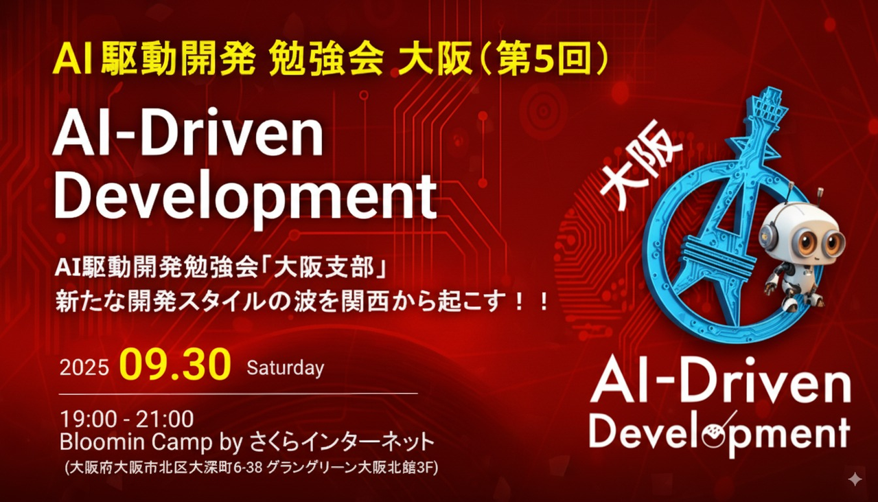 # AI駆動開発【大阪支部 #5】 ― 生成AI × LLM で切り拓く次世代開発スタイルを体験しよう!― > ハッシュタグ: `#AI駆動開発` 対象: エンジニア/PM/デザイナー/生成AIやLLMを活用した開発に興味のあるすべての方 > 主催: AI駆動開発勉強会 大阪支部 運営委員会 * * * ## イントロダクション 今回のイベントは、さくらインターネット株式会社と共同で開催させていただいております。生成AI・LLM の台頭により、コード生成・自動補完だけでなく、要件定義・UI デザイン・テスト・ドキュメント作成まで AI が関与する 「AI駆動開発」 が本格...