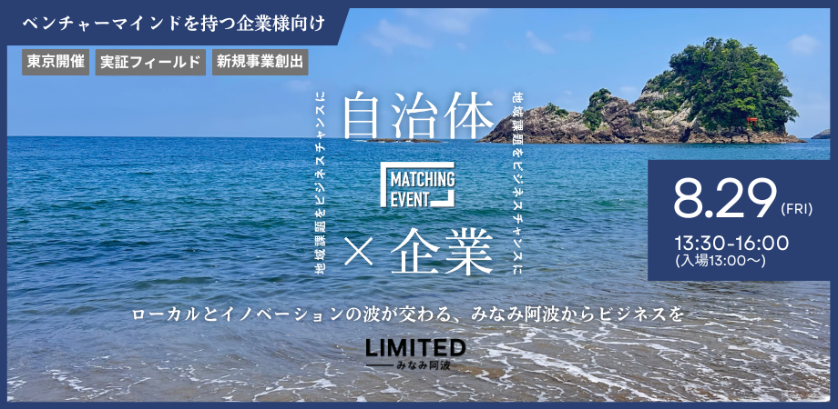 【自治体×企業マッチングイベント】初、エリア限定のLIMITED版を開催。今回LIMITED第一弾として徳島県の「みなみ阿波」から5自治体が東京にやってきます!新規事業... powered by Peatix : More than a ticket.
