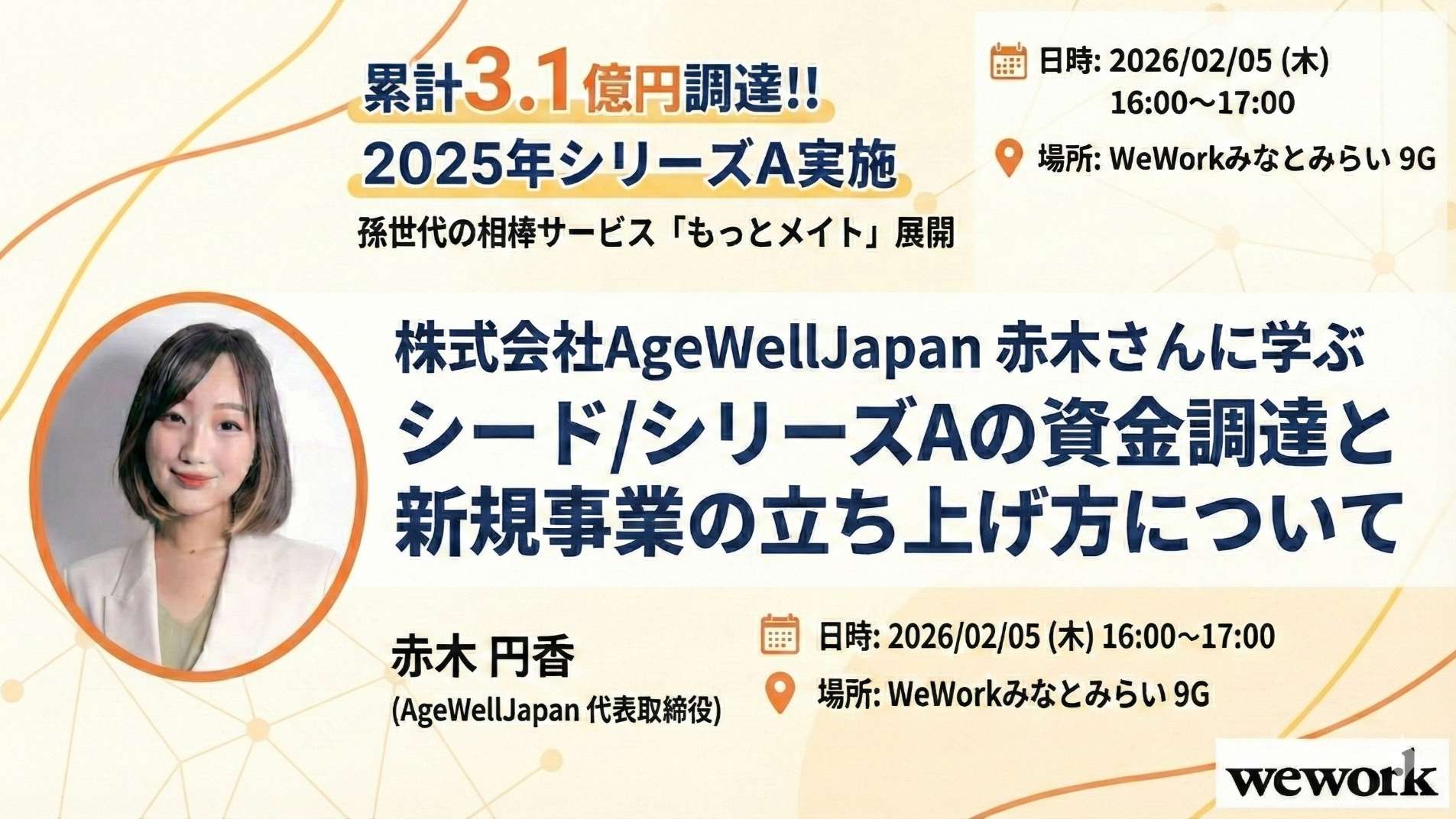 孫世代の相棒サービス「もっとメイト」などを展開し、2025年にシリーズAでの資金調達を実施、累計3.1億円を調達されている、AgeWellJapan 代表取締役の赤木円香さんをお迎えする、超有益イベントのお知らせです!!