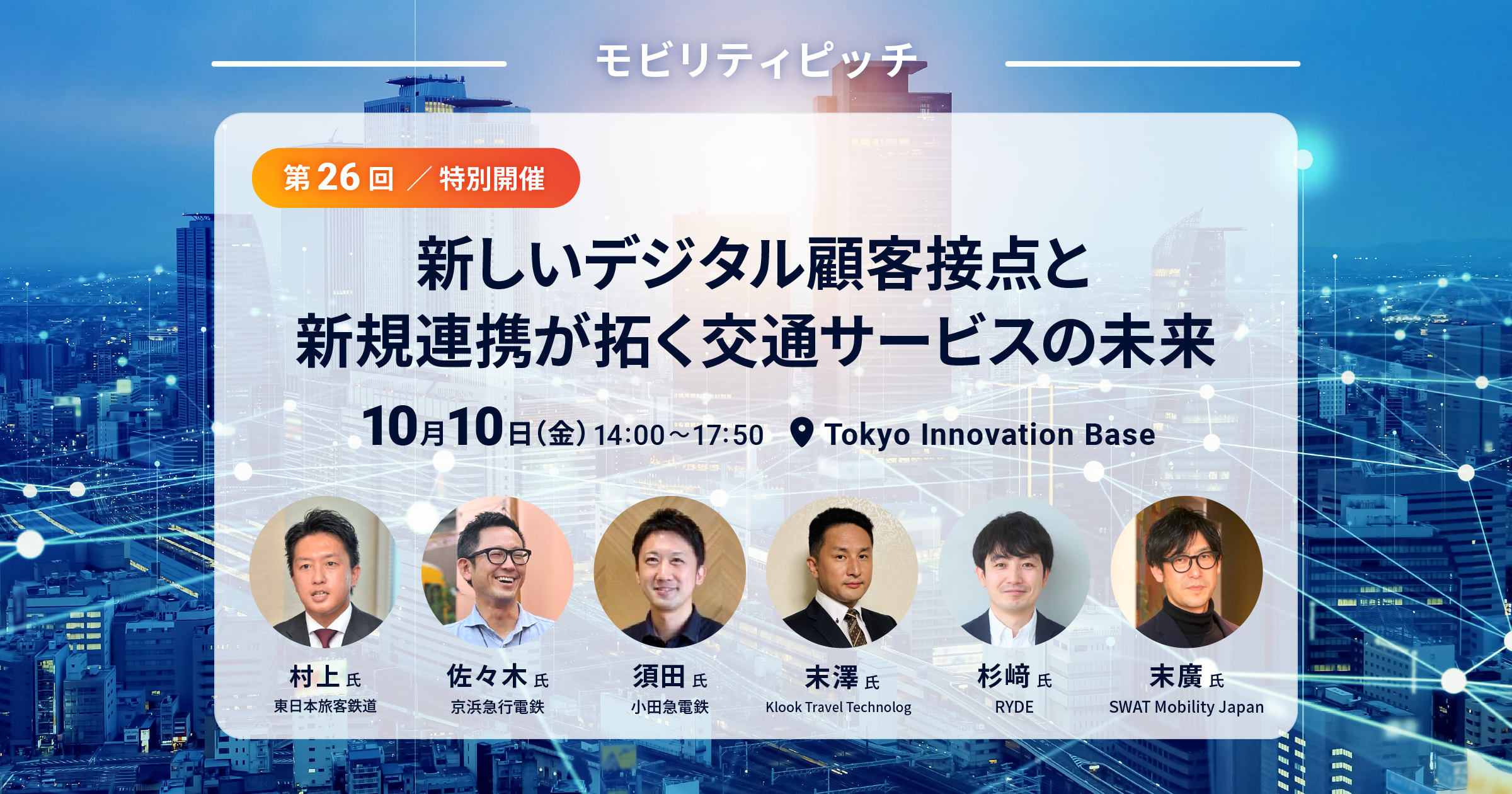 モビリティピッチ第26回は、ハイブリッドで開催し、テーマ「新しいデジタル顧客接点と新規連携が拓く交通サービスの未来」にて、6名の方々にご登壇いただきます。今回は講演とクロストーク、会場では講演者との名刺交換を含む交流の場も設ける予定です。
