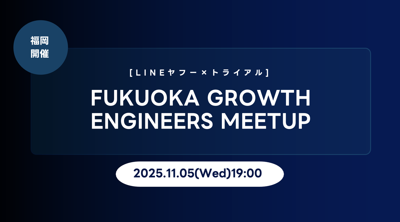 # [LINEヤフー×トライアル]Fukuoka Growth Engineers Meetup ## 開催概要 LINEヤフーとトライアルカンパニーが共催で、エンジニア向けMeetupを福岡にて開催します!✨ テーマは 「キャリア成長」。 東京ではなく福岡という地で、エンジニアがどのようにスキルを磨き、転機や失敗を乗り越えてきたのか。実際の体験をもとにリアルな声をお届けします。 また、福岡ならではのコミュニティの魅力やネットワークの広がりも紹介。これからキャリアを考えるエンジニアにとって、新たな学びとつながりを得られる場を目指しています。 💬 こんな方におすすめ * 福...