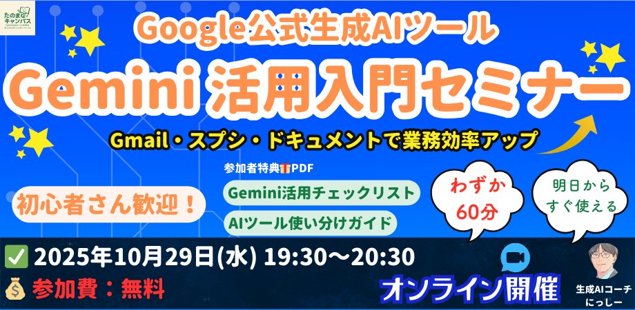 【無料セミナー】 ☆Google Gemini が気になっている方へ☆ 「調べ物に時間がかかる…」「スプシやGmailの整理に手間取っている…」そんなモ... powered by Peatix : More than a ticket.